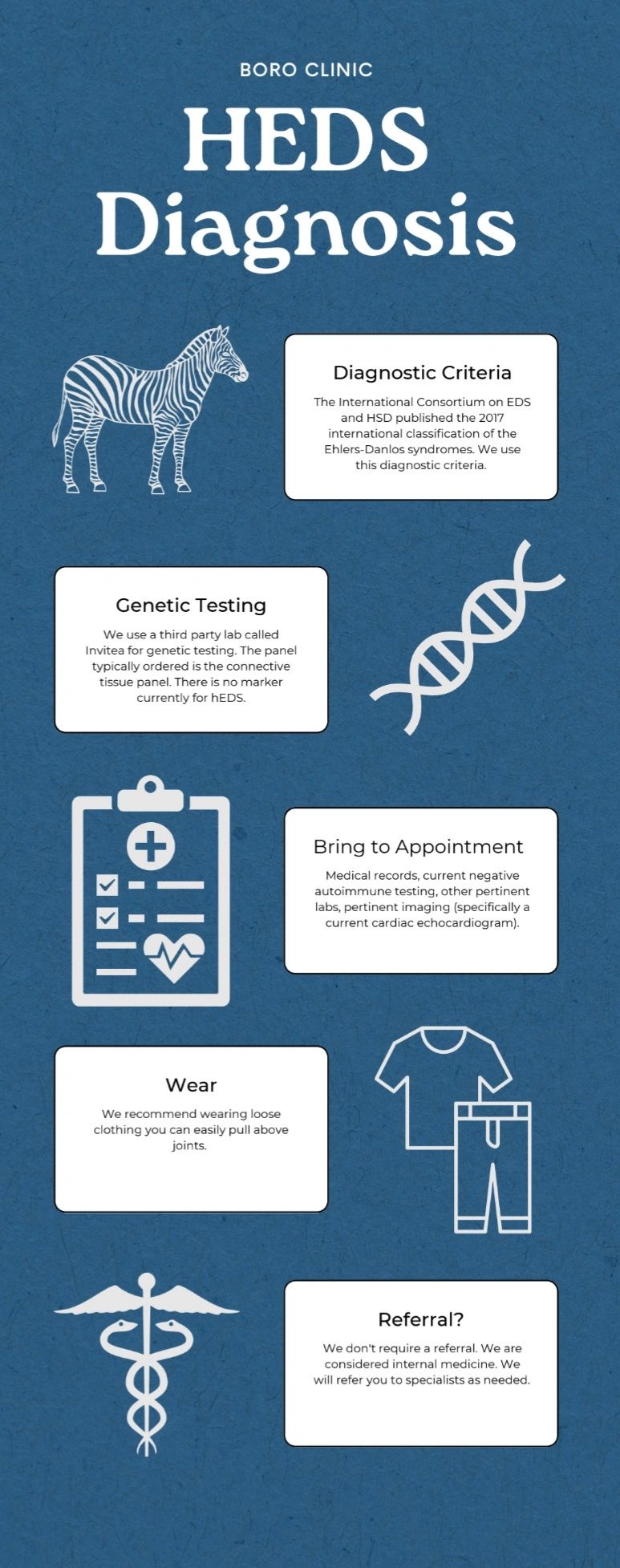 At our practice, we specialize in diagnosing and managing hEDS by focusing on both immediate symptom relief and long-term health strategies. Our care plan typically includes physical therapy for joint stability, pain management strategies, and monitoring for coexisting conditions such as mast cell activation syndrome (MCAS) and POTS. We emphasize personalized care because no two patients with hEDS have the same experience, and the disorder can significantly impact daily life.